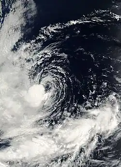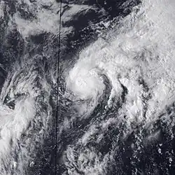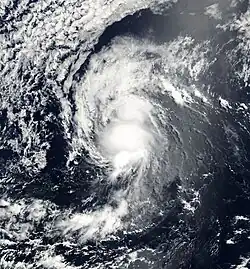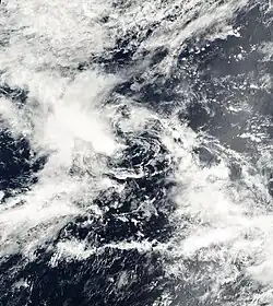 John originated on August 28 from an area of disturbed weather that was associated with the Intertropical Convergence Zone (ITCZ) near just outside the Central Pacific basin. Developing near the Central Pacific basin, John eventually entered early on August 30 and was then also monitored by the Central Pacific Hurricane Center. that was a tropical storm for several days and moved from the eastern to the central Pacific basin. Thereafter entering the central Pacific region, Tropical Storm John approached hurricane status while meandering erratically east-southeast of Hawaii. John eventually encountered strong wind shear, and dissipated on September 1. Tropical Storm John did not cause any damage or fatalities, as there were no reports of any land being affected.[30]