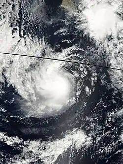 A tropical wave organized into Tropical Depression One-C on July 20 while located southeast of the Hawaiian Islands. It strengthened slowly and moved nearly due west, before reaching storm strength later on July 20. The storm was named Upana, which is Hawaiian for "Urban". Despite a favorable environment, Upana strengthened little, reaching a peak intensity on July 21 with winds of 50 mph (80 km/h). The storm had no deep convection in its circulation on July 22, and was downgraded to a tropical depression in the afternoon. Late on July 23, deep convection flared up, briefly strengthening the system again, but failed to re-gain tropical storm status, as it remained poorly organized. It dissipated on July 24, despite a low-shear environment favorable for development.[14] On July 26, a westward moving disturbance in the central Pacific basin containing remnants of Tropical Storm Upana began showing signs of organization as it neared the International Date Line. The next day, a tropical depression, designated 12W by the Joint Typhoon Warning Center (JTWC), formed about 575 mi (925 km) east of Kwajalein Atoll. The system moved generally northwestward over the next day, and gradually became better organized. At 18:00 UTC on July 28, JTWC upgraded the depression to a tropical storm and named it Chanchu. Chanchu then tracked north, before dissipating on July 30.[15][16]