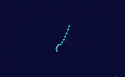 A tropical disturbance developed in the Western Pacific Ocean along the eastern periphery of the monsoon trough in mid-August. Located at 33° north, it steadily organized, and became Tropical Depression Sixteen-W on August 15 while located 1,700 miles (2,700 km) to the northwest of Honolulu, Hawaii. It moved eastward along the west–east-oriented surface pressure trough, and crossed the International Date Line later on August 15. Abnormally warm sea surface temperatures allowed the system to intensify despite its unusually high latitude, and it became Tropical Storm Wene on August 16. It quickly attained a peak intensity of 50 mph (80 km/h), but weakened due to colder sea surface temperatures and wind shear. Wene continued to weaken, and dissipated when the storm merged with an extratropical cyclone.[14]