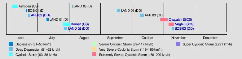 A total of twelve depressions were recorded, of which nine intensified into deep depressions. Of these nine, a total of four further strengthened into cyclonic storms, while two attained their peaks as extremely severe cyclonic storms. In early June, Cyclonic Storm Ashobaa produced significant flooding in eastern Oman and the United Arab Emirates.[2][3][4] Later that month, Deep Depression ARB 02 resulted in the worst floods in the Amreli district of Gujarat in 90 years.[5] The storm resulted in 80 deaths and an estimated 16.5 billion Indian rupees in damage in the state.[6][7] In late July and early August, Cyclonic Storm Komen resulted in between 187 and 280 deaths in northeastern India, Bangladesh and Myanmar due to torrential rains as it slowly moved through the region. In early November, Extremely Severe Cyclonic Storm Chapala, the strongest storm of the season, became the first recorded tropical cyclone to produce hurricane-force winds in Yemen. During the storm's passage, areas in southern Yemen received 610 mm (24 in) of rainfall over 48 hours, or 700% of the average yearly precipitation.[8] Just days after Chapala produced widespread damage in Yemen and the Puntland region of Somalia, Extremely Severe Cyclonic Storm Megh passed through the same region causing further destruction. Megh was judged to have been the worst tropical cyclone ever to affect the Yemeni island of Socotra, and resulted in 18 deaths on the island.[9] The final storm of the season to form, Deep Depression BOB 03, produced significant flooding in southern India and resulted in at least 71 deaths in the region in early November.[10][11]