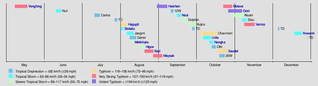 October was an extremely active month. The season started out with Typhoon Chan-hom, which lasted for 14 days before dissipating. On October 9, Tropical Storm Linfa formed, becoming the first of a train of tropical systems to affect Vietnam. Linfa killed more than 100 people and caused severe flooding in Vietnam and Cambodia. Nangka formed a few days after Linfa, though impacts were much less. A tropical depression, dubbed Ofel by the PAGASA went through the Philippines and then hit Vietnam, affecting the already flooded areas from Linfa.. After a short lull in systems, Typhoon Saudel formed on October 18, causing flooding in the Philippines. Afterwards, two very powerful typhoons formed after Saudel: Molave and Goni. The former killed 41 people throughout The Philippines, Vietnam, and Malaysia, while the latter became a Category 5-equivalent super typhoon.[nb 1] After Goni, Atsani formed and lashed Northern Luzon and Southern Taiwan as a tropical storm. As Atsani dissipated, another depression formed and affected Visayas as a depression, receiving the name Tonyo. The next day, it was upgraded to a tropical storm, earning the name Etau. Etau lasted from November 7 until November 11. On November 8, a depression formed in the Philippine Area of Responsibility and was given the name Ulysses. The next day, it was upgraded to a tropical storm, giving the name Vamco. Vamco strengthened into a Category 2-equivalent typhoon as it brushed the Luzon landmass. It quickly exited the Philippine Area of Responsibility the next day as the PAGASA stated that it restrengthened as a typhoon. It rapidly strengthened and reached its peak intensity as a Category 4-equivalent typhoon. It weakened until it dissipated north of Laos. At last in the month of December, three systems formed with one named as Krovanh which formed at the South China Sea. Then the season concluded on December 29 with a weak depression close to the coast of Vietnam.