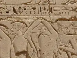 The first known mention of Peleset is at the temple of Ramesses in Medinet Habu, which refers to the Peleset among those who fought against Egypt during Ramesses III's reign,[2] and the last known is 300 years later on Padiiset's Statue. The Assyrians called the same region "Palashtu/Palastu" or "Pilistu," beginning with Adad-nirari III in the Nimrud Slab in c. 800 BCE through to an Esarhaddon treaty more than a century later.[3][4] Neither the Egyptian nor the Assyrian sources provided clear regional boundaries for the term.[5] Whilst these inscriptions are often identified with the Biblical Pəlīštīm, i.e. Philistines,[6] the word means different things in different parts of the Hebrew Bible.[7][8] The 10 uses in the Torah have undefined boundaries and no meaningful description, and the usage in two later books describing coastal cities in conflict with the Israelites – where the Septuagint instead uses the term allophuloi (Αλλόφυλοι, 'other nations') – has been interpreted to mean "non-Israelites of the Promised Land".[9][10]