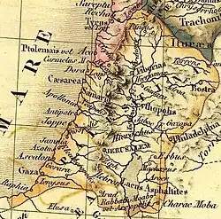 Writers during this period also used the term Palestine to refer to the entire region between Syria and Egypt, with numerous references to the Jewish areas within Palestine.[78][79] It has been contended that some first century authors associated the term with the southern coastal region.[80][81]