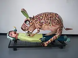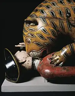 Die Seele (The Souls), a work by painter Jan Balet (1913–2009), shows an angel trumpeting over a flower garden while a tiger devours a uniformed French soldier.[62] The Indian painter M. F. Husain painted Tipu's Tiger in his characteristic style in 1986 titling the work as "Tipu Sultan's Tiger".[67] The sculptor Dhruva Mistry, when a student at the Royal College of Art, adjacent to the Victoria and Albert Museum, frequently passed Tipu's Tiger in its glass case and was inspired to make a fibre-glass and plastic sculpture Tipu in 1986.[62] The sculpture Rabbit eating Astronaut (2004) by the artist Bill Reid is a humorous homage to the tiger, the rabbit "chomping" when its tail is cranked round.[68]