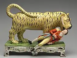 However a similar scene was depicted on the silver mount on a gun made for Tipu and dated 1787–88, five years before the incident.[17] The Metropolitan Museum of Art, which owns the Staffordshire figure group illustrated, suggests that the continuing popularity of the subject into the 1820s was due to Tipu's automaton being on display in London.[18]