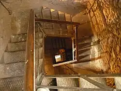 The entrance to the tower, located on the southern side, is reached via a short flight of steps. The gate is topped by a semicircular arch of carved stone and framed on three sides by a stepped border made of stones with curved profiles. The entrance features six elegantly crafted stones, which contribute to its aesthetic appeal. Inside, a metal ladder leads to the upper levels.