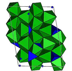 Crystal structure of clinohumite in polyhedral representation, a-axis projection, b-horizontal. H atom are blue spheres.