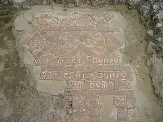 Substantial stretches of the late mediaeval tile floors survive to this day. An inscription which used to lie before the entrance to the canons' refectory, was later covered and preserved beneath the steps leading up to Wriothesley's banqueting hall. Two other patches of tiling survive to the north of the gatehouse. Following the expulsion of the canons, these were concealed beneath the spiral staircases installed in Wriothesley's reconstruction, and therefore escaped being torn out with the rest of the tiles along the cloister walk.[23] In winter, the tiles are covered over with sand by English Heritage staff in order to protect them from damage in the cold weather.