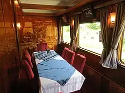 These saloon cars are air-conditioned. The banquet hall has a capacity of 28 seats, while the lounge area has 10 armchair seats. The cars are equipped with a full-channel sound system and a cinema projector. The car's maximum speed is 140 km/h (85 mph). "NO" exchange mode. They can travel only in the Blue train set. The cars also have telephone installations. The car is heated by steam.