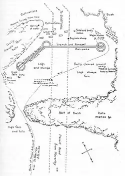 The Māori camp had been established just four days earlier, in hilly, bush-covered country below the high wooded tableland of Okutuku, a village that had been raided in January 1866 as part of a "bush-scouring" campaign by Major-General Trevor Chute during the earlier hostilities. About 100 metres of 3.6m-high loose palisading had been hastily erected in a concave shape, blocking the path to the pā, while other defensive works included a long trench 2m wide and 2m deep behind the palisade, as well as hidden rifle pits and three taumaihi, 6m-high towers built of packed soil and ferns.[10] While men in the trenches could fire through a gap beneath the palings of the palisade, others on an earth bank behind the trenches could fire through gaps in the palings, while a third line of fire could be effected from the taumaihi.[1] Tītokowaru had placed his men on high alert and in the misty dawn, sentries caught sight of Whitmore's advance guard moving through the bush. The Moturoa defenders were silently roused and took their firing positions without being seen by the attacking force.[10]