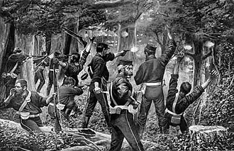 Less than three weeks later, on 7 September 1868, McDonnell returned to the Ngāti Ruanui heartland, this time determined to skirt Te Ngutu o Te Manu and first strike at another village to the east, Ruaruru, before returning to Te Ngutu. The plan went awry when his column of 360 men became disoriented in the forest, missing Ruaruru and approaching Te Ngutu from the north. Shots fired at the occupants of outlying huts warned Tītokowaru of the direction of McDonnell's approach, giving the chief time to organise his defence. He remained in the pā with 20 men and sent the remaining 40, in small groups, to hidden rifle pits in bush surrounding a clearing that led to the palisade, and possibly other positions within the clearing itself. McDonnell's force, attempting to storm the palisade, came under immediate and very heavy fire from front, right and rear, with troops "being knocked over like ninepins" by unseen marksmen.[1] Again the heart of the first soldier killed was cut from his body as a Hauhau war rite.[1][8] McDonnell hesitated, torn between advancing with further losses or retreating, watching as the inexperienced volunteer recruits from the Wellington Rangers and Rifles either bunched together and froze or panicked and fled.[8] McDonnell then gave the order to retreat, with casualties carried out first and McDonnell following with 80 men. Major Gustavus von Tempsky, near the palisade, was shot dead while awaiting orders, and four other officers—two captains and two lieutenants—were also killed. Tītokowaru's small attacking force was quickly reinforced by warriors from neighboring villages and McDonnell's retreat to Waihi came under relentless fire from Māori who followed them almost to the Waingongoro, inflicting further casualties.[1] The expedition left 24 Europeans killed and 26 wounded.[8]