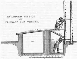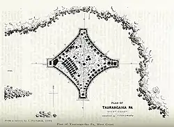 Tītokowaru used those five weeks to demonstrate his hold on the Wanganui hinterland, burning farms and abandoned military posts and driving off stock, but also laboring over the fortifications at Tauranga-ika until it became one of the most formidable modern pā ever built.[1] The pā had been built in a diamond shape, 135 metres long on each side, complete with trenches, rifle pits, parapets and a double line of stockade.[11] The palisade, attached to 30 cm-thick posts, reached 5m above the ground, with a gap at its base to allow defenders in the trenches to fire beneath it. Inside the pā were trenches, covered walkways and shellproof underground shelters roofed with strong timbers, packed earth and galvanised roofing iron. At one corner was a 10m-high taumaihi,[4]: 285–294 providing a third level of fire. Inspecting it later, Whitmore wrote in his report of 3 February 1869, "No troops in the world could have hewn their way through a double row of strong palisades, backed by rifle pits, and flanked by two-storeyed erections, such as was constructed in this fortification, defended by excellent shots and desperate men."[12]