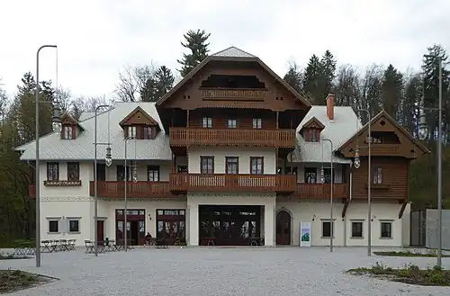 An alpine-style building called the Švicarija (German: Schweitzerhaus 'the Swiss House', formerly the Tivoli Hotel)[2] stands behind the mansion. The Jesenko Nature Trail leads past it.