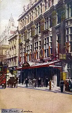 The Tivoli Theatre of Varieties was a popular English theatre based in the Strand, West London. It was designed by Charles Phipps and was built during 1889–90 at a cost of £300,000. It was constructed on the former site of the Tivoli Beer Garden and Restaurant.[1] In the consortium that financed the project was the actor Edward O'Connor Terry.[2] The hall opened on 24 May 1890 and was located opposite the Adelphi Theatre.[3]