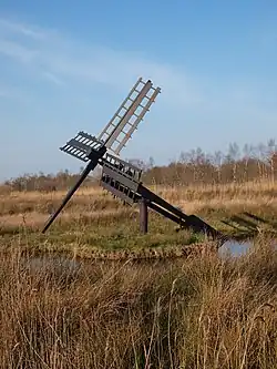 The paaltjasker was built in 1973 by R.W. Dijksma as the fifth in a 'new' series of post-war tjaskers[23] and placed in nature reserve De Deelen, west of Tijnje. The mill is owned by Staatsbosbeheer and can be used to pump water into the nature reserve. The four symmetrical Common sails have a span of 5.28 metres (17 ft 4 in) and are covered by wooden slats instead of sail cloth.[24][25]