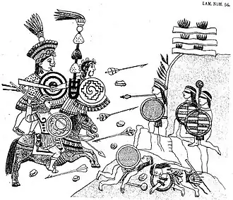 Between these walls, the Sierra del Mixtón to the east and the Sierra de Tepeque to the west, transited Nuño Beltrán de Guzmán and his soldiers, leaving, according to the historian Peter Gerhard, “a path of corpses and destroyed houses and crops, impressing surviving males into service and leaving women and children to starve.” Frame 56 of the Lienzo de Tlaxcala describes a battle in which the Caxcans of “Tlaltenapa” defended their lands against the Spanish and their Tlaxcaltec allies.