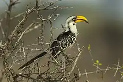The Eastern yellow-billed hornbill (Tockus flavirostris), also known as the northern yellow-billed hornbill,[1] is a species of hornbill in the family Bucerotidae. It is found in Djibouti, Eritrea, Ethiopia, Kenya, Somalia, South Sudan, Tanzania, and Uganda. It resembles the southern yellow-billed hornbill, but has blackish (not pinkish) skin around the eyes.