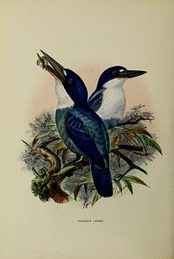 The lazuli kingfisher (Todiramphus lazuli) is a species of bird in the family Alcedinidae. It can be found on the islands of Seram, Ambon and Haruku. Found singly and in pairs in lowland wooded areas, including cultivated areas and mangroves. Pale blue underside is unique among kingfishers in its limited south Moluccan range. Rowdy vocalizations include repetitive “ker-chick” series and “ki-ki-ki-ki…” calls. It gets its name due to its colour being reminiscent of Lapis Lazuli.