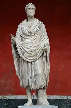 The most complex togas appear on high-quality portrait busts and imperial reliefs of the mid-to-late Empire, probably reserved for emperors and the highest civil officials. The so-called "banded" or "stacked" toga (Latinised as toga contabulata) appeared in the late 2nd century AD and was distinguished by its broad, smooth, slab-like panels or swathes of pleated material, more or less correspondent with umbo, sinus and balteus, or applied over the same. On statuary, one swathe of fabric rises from low between the legs, and is laid over the left shoulder; another more or less follows the upper edge of the sinus; yet another follows the lower edge of a more-or-less vestigial balteus then descends to the upper shin. As in other forms, the sinus itself is hung over the crook of the right arm.[105] If its full-length representations are accurate, it would have severely constrained its wearer's movements. Dressing in a toga contabulata would have taken some time, and specialist assistance. When not in use, it required careful storage in some form of press or hanger to keep it in shape. Such inconvenient features of the later toga are confirmed by Tertullian, who preferred the pallium.[106] High-status (consular or senatorial) images from the late 4th century show a further ornate variation, known as the "Broad Eastern Toga"; it hung to the mid-calf, was heavily embroidered, and was worn over two pallium-style undergarments, one of which had full length sleeves. Its sinus was draped over the left arm.[107]