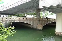 The Tokiwabridge (常盤橋) is a bridge over the Nihonbashi River between Ōtemachi, Chiyoda, Tokyo and Nihonbashi Motoishi-chō, Chūō, Tokyo. There are actually two separate "Tokiwa Bridges": a pedestrian-only stone bridge which led to a gate of Edo Castle and a road bridge constructed after the 1923 Great Kanto Earthquake located 70 meters away. Both of these bridges are made from stone, have a double arch structure.