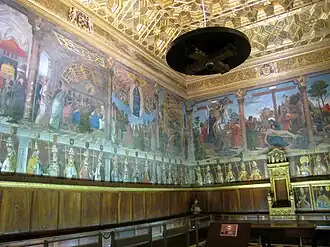 The chapel is decorated in two different parts. First, from the cornice to the ceiling, the Apostles' Creed is represented in fourteen scenes in the manner of the dial of a clock. At the lower part beneath the cornice is a painting of the Final Judgement and scenes of the Lives of the Saints. The authorship of the works is not clear, even though it remains attributed without a doubt to Florentine painters, among whom are mentioned as very probably the artists: Gherardo Starnina and Nicolás de Antonio. Deterioration caused by excessive humidity and some badly done restorations have damaged the paintings closest to the floor, in some cases irremediably.