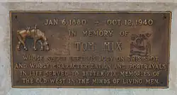 For his contribution to the motion picture industry, Mix has a star on the Hollywood Walk of Fame at 1708 Vine Street. His cowboy boot prints, palm prints and the hoof prints of his horse, Tony, are at Grauman's Chinese Theatre, at 6925 Hollywood Boulevard. In 1958 Mix was inducted posthumously into the Western Performers Hall of Fame at the National Cowboy & Western Heritage Museum in Oklahoma City, Oklahoma. In 1959, a "Monument to the Stars" was erected on Beverly Drive (where it intersects Olympic Boulevard and becomes Beverwil) in Beverly Hills. The memorial consists of a bronze-green spiral of sprocketed "camera film" above a multi-sided tower, embossed with full-length likenesses of early stars who appeared in famous silent movies. Those memorialized include Douglas Fairbanks, Mary Pickford, Will Rogers, Conrad Nagel, Rudolph Valentino, Fred Niblo, Harold Lloyd, and Mix. There is also a Tom Mix museum in Dewey, Oklahoma.[27][28] Opening in 1965, and still operational as of 2025, the Tom Mix museum in Dewey- which was also where his third wife Olive was raised and the birthplace of his eldest daughter Ruth- managed to obtain many of Mix's personal items.[26] Additionally, from 1986 to 2002 there existed another museum in his birthplace of Mix Run, Pennsylvania.[29] Between 1980 and 2004, 21 Tom Mix festivals were held during the month of September, most of them in DuBois, Pennsylvania.