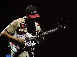 Morello uses a number of often heavily-modified guitars from various manufacturers to create his "unconventionally iconic" guitar tone, and many of them feature slogans in homage to Woody Guthrie's "This Machine Kills Fascists" acoustic.[88][89][90] His most famous such guitar—which bears the painted text "Arm the Homeless"—was a Stratocaster-style custom shop build he commissioned before joining his first band in California.[91] Displeased with the result, Morello spent several years modifying it, repeatedly swapping pickups, necks, and bridges in a vain attempt to replicate the tones of Randy Rhoads and Nuno Bettencourt. Morello eventually abandoned this pursuit and chose to instead "take whatever sound this thing makes and I’m going to create with it."[91] He added "Arm the Homeless" text before a gig at the Whisky a Go Go because he liked the "provocative and militant situationist" slogan juxtaposed with smiling hippopotamus graphics he had previously added. The guitar is his main instrument for songs in standard tuning.[91]