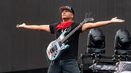 Thomas Baptist Morello (born May 30, 1964) is an American guitarist, singer, songwriter and political activist. He is known for his tenure with the rock bands Rage Against the Machine and Audioslave. Between 2016 and 2019, Morello was a member of the supergroup Prophets of Rage. Morello was also a touring musician with Bruce Springsteen and the E Street Band.[4] Under the moniker the Nightwatchman, Morello released his solo work. Together with Boots Riley, he formed Street Sweeper Social Club. Morello co-founded Axis of Justice, which airs a monthly program on Pacifica Radio station KPFK (90.7 FM) in Los Angeles.