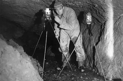 Planina was the third in the line of great Slovenian cave photographers, after Bogomil Brinšek (1884–1914) and Franci Bar (1901–1988), from whom he learned the arts and crafts of traditional cave photography.[40][2] Already in the 1960s, he started to use 35 mm single-lens reflex cameras instead of large-format cameras, ubiquitous in cave photography at the time. Planina also abandoned air-polluting flash powder as a means of illumination and was the first to master the use of electronic flash. Proper lighting of large underground spaces, especially with low-reflection surfaces, such as mud, requires a sequence of multiple flashes at full power, usually from several positions. To make the application of electronic units feasible Planina added a large external battery pack which shortened the flash refresh rate to just a few seconds and made possible several hundred flashes.[2] His photos documented most of DZRJL expeditions in the 1960s and 1970s, while his most accomplished works were made in Križna jama water cave. Planina's works appeared regularly in the natural science press, they were used for cave promotion,[41] and he also published articles about caves and cave photography techniques.[42][43]