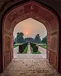 The gardens surrounding the tomb are vast, and laid out in the Persian Chahar Bagh, or Paradise garden.[24] The garden is separated into four squares by paved walkways (khiyabans) and two bisecting central water channels which are designed to reflect the four rivers that flow in jannat, the Islamic concept of paradise. Each of the four squares is further divided into smaller squares with pathways, creating into 16 squares in all. The garden forms a quadrangle measuring approximately 500 metres on each side.[22]