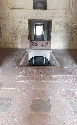 The mausoleum contains three tombstones: one in the underground mortuary chamber, which is the grave itself; the cenotaph above it; and another cenotaph on the terrace.[15] The ground floor consists of some forty chambers, which bear faint traces of paintings on plastered walls. The center of the ground floor houses the cenotaph of Empress Mariam-uz-Zamani.[9]