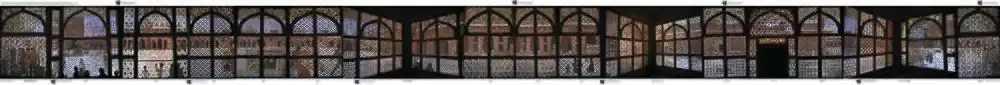 The door to the main chamber is intricately carved with arabesque patterns and bears inscriptions from the Quran. Brown marble borders the interior bays while the relief panels - with the Quran verses - have a blue background. The carved and painted tomb chamber has a white marble floor, which is inlaid with multicolored stones. The multicoloured stones which are also a piece of diamond ruby or emerald.
