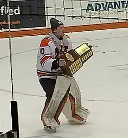 During the 2023–24 season, in his junior year, he appeared in 36 games and posted a 25–9–2 record, with a 2.26 GAA, and .925 save percentage. His 25 wins were the second-most in program history, and ranked third nationally. He set a single-season program record with 1,015 saves.[1] On January 26, 2024, with a 3–0 victory against Bentley, Scarfone earned his 44th win for the Tigers, becoming the all-time leader in wins at RIT during the Division I era.[4] The Tigers clinched a first round bye in the 2024 Atlantic Hockey men's ice hockey tournament after defeating Air Force on February 16, 2024, and earned first place in the Atlantic Hockey regular season after Bentley defeated second place Holy Cross on February 22, 2024.[5] This was the Tigers' second consecutive regular season championship. He helped lead RIT to the Riley Trophy as Atlantic Hockey tournament champions, and advanced to the NCAA tournament for the first time since 2016.[6] Following an outstanding season, he was named to the All-Atlantic Hockey First Team for the second consecutive season, named the Atlantic Hockey Goaltender of the Year, and named a semifinalist for the Mike Richter Award.[7][8][9]