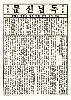 Tongnip sinmun (Korean: 독립신문; Hanja: 獨立新聞), also known by its translated title The Independent, was a historic newspaper printed in Korean and English and published between 1896 and 1899. It was the first privately managed daily newspaper in Korea and the first to print editions written exclusively in Hangul (and not interspersed with Hanja, as was common practice).