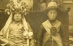Within social anthropology research of Chinese marriage, shim-pua marriage is referred to as a "minor marriage" because the daughter-in-law joins her future husband's household when both are minors, in contrast to Chinese major marriage, in which the bride joins her husband's household on the day of the wedding.[3] The shim-pua daughter was often adopted into a family who already had a son to whom she would be betrothed, though this was not always the case. Instead, some families adopted a shim-pua daughter prior to having a son, prompted by a traditional belief that adopting a shim-pua would enhance a wife's likelihood of bearing a son.[4] Although the shim-pua daughter joins the household as a child, the marriage would only occur after both had reached puberty. Depending upon the family's socioeconomic status and financial means, the wedding could range from a large banquet on par with a major marriage to a small family ceremony, or in the simplest cases "a bow to the ancestors and a slight change in the family's sleeping arrangements."[5]