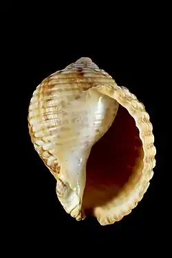 The shell is moderate to large, fragile and globular in shape. It features a very large aperture and a low spire. The surface is sculpted with well-developed, broad, flat-topped spiral cords, and the base has a pronounced siphonal notch. Adult animals lack an operculum. This species is highly variable, with both shallow- and deep-water forms. On the Agulhas Bank, shells tend to be more globular, with a lower spire, a pronounced shoulder, and a slightly sunken suture. [3]