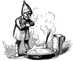In a Norwegian tale,[r] a maid decided to eat the porridge herself, and ended up severely beaten by the nisse. It sang the words: "Since you have eaten up the porridge for the tomte (nisse), you shall with the tomte have to dance!"[s] The farmer found her nearly lifeless the morning after.[95][q] In a Northern Danish variant, the girl behaves more appallingly, not only devouring the beer and porridge, but peeing in the mug and doing her business (i.e., defecating) in the bowl. The nisse leaves her lying on a slab above the well.[106] The motif occurs in Swedish-speaking Finland with certain twists. In one version, the servant eats the tomte's porridge and milk to bring his master to grief, who winds up having to sell the homestead when the sprite leaves.[107] And in the legend from Nyland (Uusimaa)[t] it decides the rivalry between neighbor the Bäckars and the Smeds, the boy from the first family regains the tomte lost to the other family by intercepting the offering of milk and porridge, eating it, and defiled it in "shameful manner ". The tomte returning from the labor of carrying seven bales of rye exclaimed some words and reverted to the old family.[108]