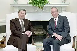 In July 1987, President Ronald Reagan nominated Robert Bork to the Supreme Court seat vacated by Lewis F. Powell Jr., who had announced his retirement in late June.[10] However, he was rejected 42–58 by the Senate on October 23.[11] The president's next nominee, Douglas Ginsburg,[12][13] withdrew his name from consideration on November 7 after admitting to marijuana use,[14] and Senate Judiciary Committee member Patrick Leahy said that if Reagan's next nominee was unacceptable to Senate Democrats,[a] they would refuse hearings for any candidate until after the 1988 presidential election.[16]