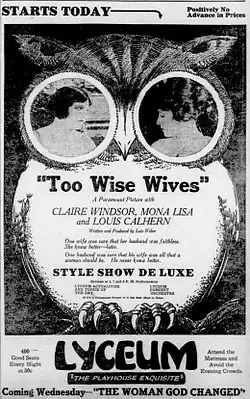 Too Wise Wives is a 1921 American silent drama film directed by Lois Weber, written by Lois Weber and Marion Orth, and starring Louis Calhern, Claire Windsor, Phillips Smalley, and Mona Lisa. It was released on May 22, 1921, by Paramount Pictures.[1][2] A copy of the film is in the Library of Congress.[3]