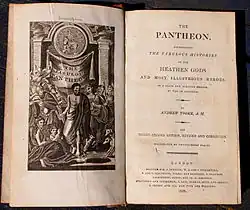 Tooke’s Pantheon is the informal name of The Pantheon, representing the fabulous histories of the heathen gods and most illustrious heroes, in a short, plain and familiar method by way of dialogue, which first appeared in 1694.[1] The Pantheon is Andrew Tooke’s translation of fr:François-Antoine Pomey’s Pantheum mythicum, seu Fabulosa deorum historia, which was originally published in Latin in 1659. Both Tooke's English Pantheon and Pomey's Latin original remained popular texts for students of Greek and Roman mythology for well over a century.