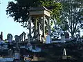 Throughout the cemetery, the topography provides the social division of the cemetery with private graves occupying the highest ground in each portion, public graves along the lower sections and paupers and criminals occupying the low-lying, water logged ground along the creek. The contrast is stark between elaborate monuments built by the elite on the highest ground in an attempt to cheat death through immortality, when compared to the unmarked graves of anonymous paupers on low lying water logged ground. With two exceptions, the Presbyterians in Portion 24 and the Primitive Methodists mostly in Portion 6, the creek serves to separate the general ground to the south from the ground occupied by religious denominations to the north.[2]