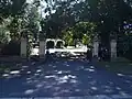 The main entrance to the Toowong Cemetery is at the south-east corner of the site on the corner of Milton Road and Frederick Street through a semi-circular gateway comprising stone gate posts and a cast iron fence on a brick masonry base with stone coping constructed c. 1915. The gate posts are a simplified version of those to the design by Colonial Architect, FDG Stanley erected in 1873–74. The fence extends past Valentine Street on the Frederick Street boundary but is not continuous – a length of fence has been removed. To the west the fence extends more than a hundred metres and includes a narrow gate opening. The remainder of the site is unfenced but the hilly terrain to the northern, western and southern boundaries and the line of eucalypt trees along the Frederick Street prevent vehicles entering the site apart from two other entrances on Richter Street and Frederick Street, which are fitted with modern boom gates.[2] The cemetery is open from 6am to 6pm (the main entrance gates and boomgates are locked outside these hours).[19] However, pedestrian access is still possible at other points on the boundaries.