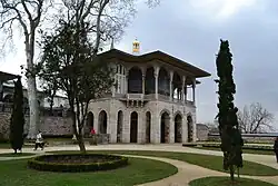 The Audience Chamber, also known as the Chamber of Petitions (Arz Odası), is right behind the Gate of Felicity. This square building is an Ottoman kiosk, surrounded by a colonnade of 22 columns supporting the large roof with hanging eaves. The building dates from the 15th century. The ceiling of the chamber was painted in ultramarine blue and studded with golden stars. The walls were lined with blue, white and turquoise tiles.[62] The chamber was further decorated with precious carpets and pillows. The chamber was renovated in 1723 by Sultan Ahmed III. It was destroyed in the fire of 1856 and rebuilt during the reign of Abdülmecid I.[63]