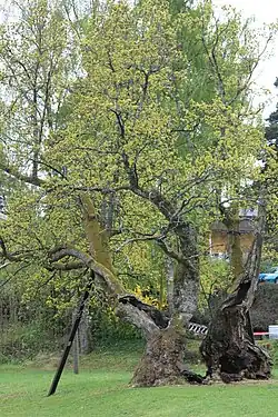 The Tordenskiold Oak (in Norwegian:Tordenskioldeika) in Kjølhalskogen in Horten, Norway is one of the oldest trees in Norway. The tree trunk is very hollow, so the tree is almost split in two. The oak was protected by a royal decree on December 9, 1921. It is not possible to say how old the tree is, but it goes for at least 800, maybe close to 1,000 years. The tree has been supported and bolted to hold the trunk together, and a fence has been set up around the tree as a hedge on the day it falls.
