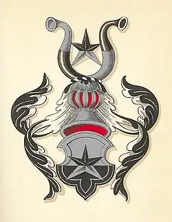 Description: A divided shield, whereof the first field in white and the second field in black, whereover is placed a five-pointed star whereof the three upper points are black and the two lower points are white. On the helm a five-pointed star in ditto tinctures between two (European) bison horns divided in black and white, vice versa, respectively.