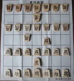Tori shōgi (禽将棋 or 鳥将棋, 'bird chess') is a variant of shogi (Japanese chess), which was invented by Toyota Genryu in 1799 despite being traditionally attributed to his master Ōhashi Sōei. It was first published in 1828 and again in 1833. The game is played on a 7×7 board and uses the drop rule; it is the only traditional shogi variant, possibly besides wa shogi, to do so. This is one of the more popular shogi variants. There were tournaments in London and Royston in the 1990s and early 2000s.