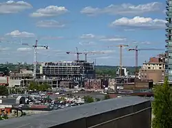 The Toronto waterfront has seen at least 15 design charettes over the last 65 years, the most recent being the Innovative Design Competition for the Central Waterfront that took place in 2006. This charette was won by a team led by West 8, a landscape architecture and urban design firm from Rotterdam, in joint venture with DTAH (du Toit Allsopp Hillier), a Toronto architecture, landscape architecture and urban design firm.[5] The proposed design includes a wide promenade along the water and extensive green space. Bridges and WaveDecks rising from the boardwalk and spanning the ends of the slips will provide continuous public access to the lakeshore. Additionally, the southern half of Queens Quay will be turned into a pedestrian walkway.[6] The proposal also emphasizes the need for stronger north–south connections between the harbour and the downtown core. The first phase was to be completed by 2008. As of January 2008, no such work has been undertaken, but private developers began construction of a condominium complex at the foot of Yonge Street, and TEDCO started construction of Corus Quay.