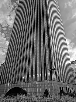 The structure has a rectangular footprint with a windowless two-storey base. A wide round arch, resting on an underground steel structure for support, serves as the entrance and supports the façade above. The opening under this arch is covered by a special security glass named STADIP (the one used in Torre Agbar in Barcelona). Windows on floors 3 through 43 are grouped in twos divided by a slender pier. The groupings are divided by larger piers into 15 bays across the front of the building and 11 bays on the sides. The façade is covered in white aluminum and the corners of the structure are chamfered.[1] The top two floors are also windowless and the parapet flares to form a cornice. Elevators, in three groupings, occupy a bay in the rear of the structure along with stairways.