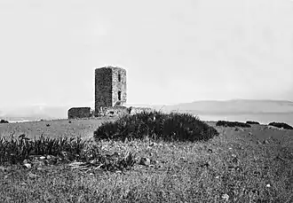 Little remains of the structure today, but plenty of historical data and photographs provide an insight into the structure and proportions. The tower had three floors, the first of them separated from the rest and that was accessed by a door at ground level. The second floor had a ladder attached to the wall outside. The third was reached by interior stairs. The building had a height of 14 metres (46 ft) and was rectangular in shape, 4 by 6 metres (13 by 20 ft), with walls 1.5 metres (4 ft 11 in) thick.[4] The tower was surrounded by an octagonal mud wall, 80 inches (2,000 mm) thick and 3.5–4.5 metres (11–15 ft) high.[3]