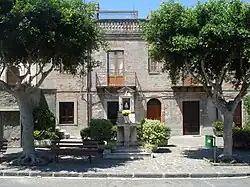 Historians agree that the toponym Torregrotta is a combination of the words Torre (tower) and Grotta (cave), the two adjacent districts that form the historic center of the city.[21] The origin of both terms can be traced back to the presence of two structures in the area, i.e. at least two towers (one of which is still present in Via Trieste)[21] and several caves.[62] What was initially the Hamlet of the Feud of Santa Maria della Scala (1526) took on the name Torre in the first half of the 19th century,[21] as can be seen in two deeds dated 1815[63] and 1817.[64] The adjacent district of Grotta, on the other hand, already existed in the 16th century, as attested by a notarial deed dated 1585.[65] The town acquired its current name around the middle of the 19th century;[1] in fact, the first official documents in which the two words appear for the first time together in the place name Torre Grotta are the Dizionario Topografico della Sicilia (Topographical Dictionary of Sicily) by V. Amico from 1855[1] and a notarial deed dated October 13, 1857.[66]